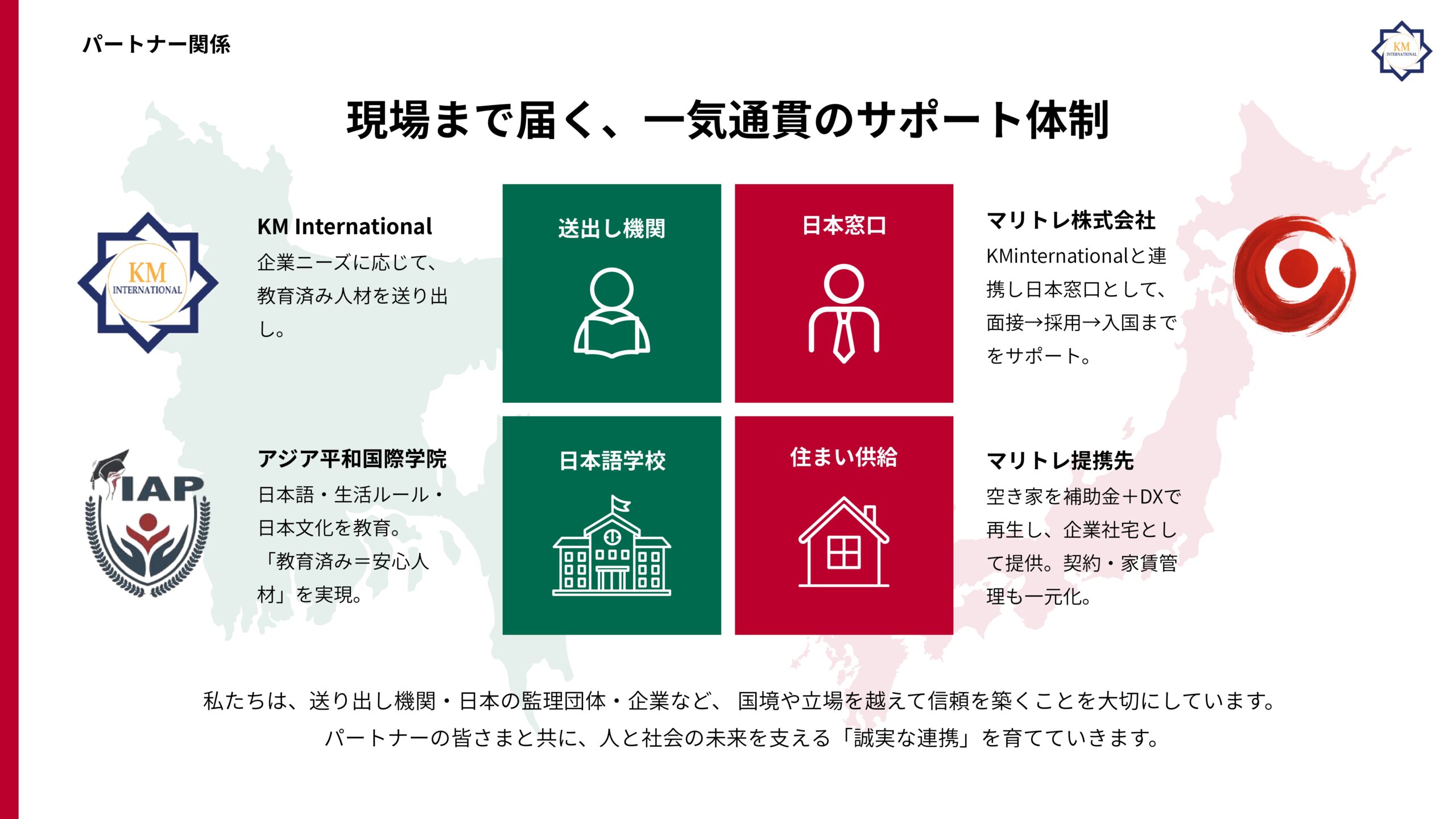 マリトレは、この6つを軸に、外国人材と企業の双方が安心して働ける環境を整え、「絶対」に近づけます